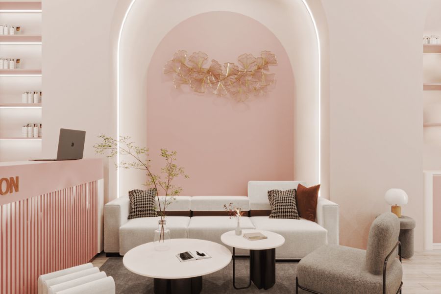 Khu vực lễ tân được thiết kế theo phong cách hồng pastel kết hợp trắng đá vân nhẹ, giống y hình bạn cung cấp. Quầy lễ tân có thiết kế bo cong mềm mại, tạo sự thân thiện và góp phần thể hiện bản sắc thương hiệu.
