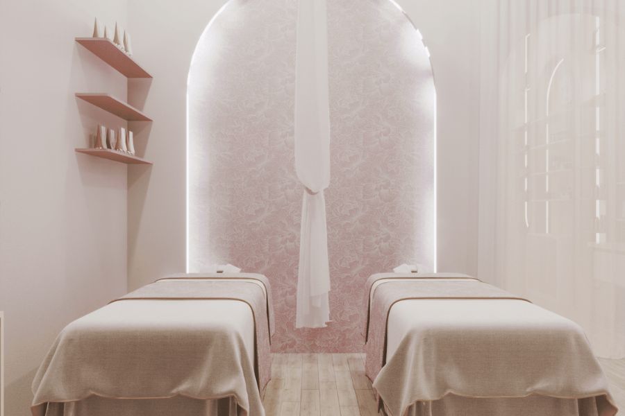 Phòng spa được bao phủ bởi tone trắng hồng dịu nhẹ. Hai giường massage được đặt song song, phủ drap màu kem mang lại cảm giác sạch sẽ và thư giãn. Tường sau giường là bức vòm lớn màu hồng hoa văn pastel, bao quanh bởi hệ LED ánh sáng nhẹ.